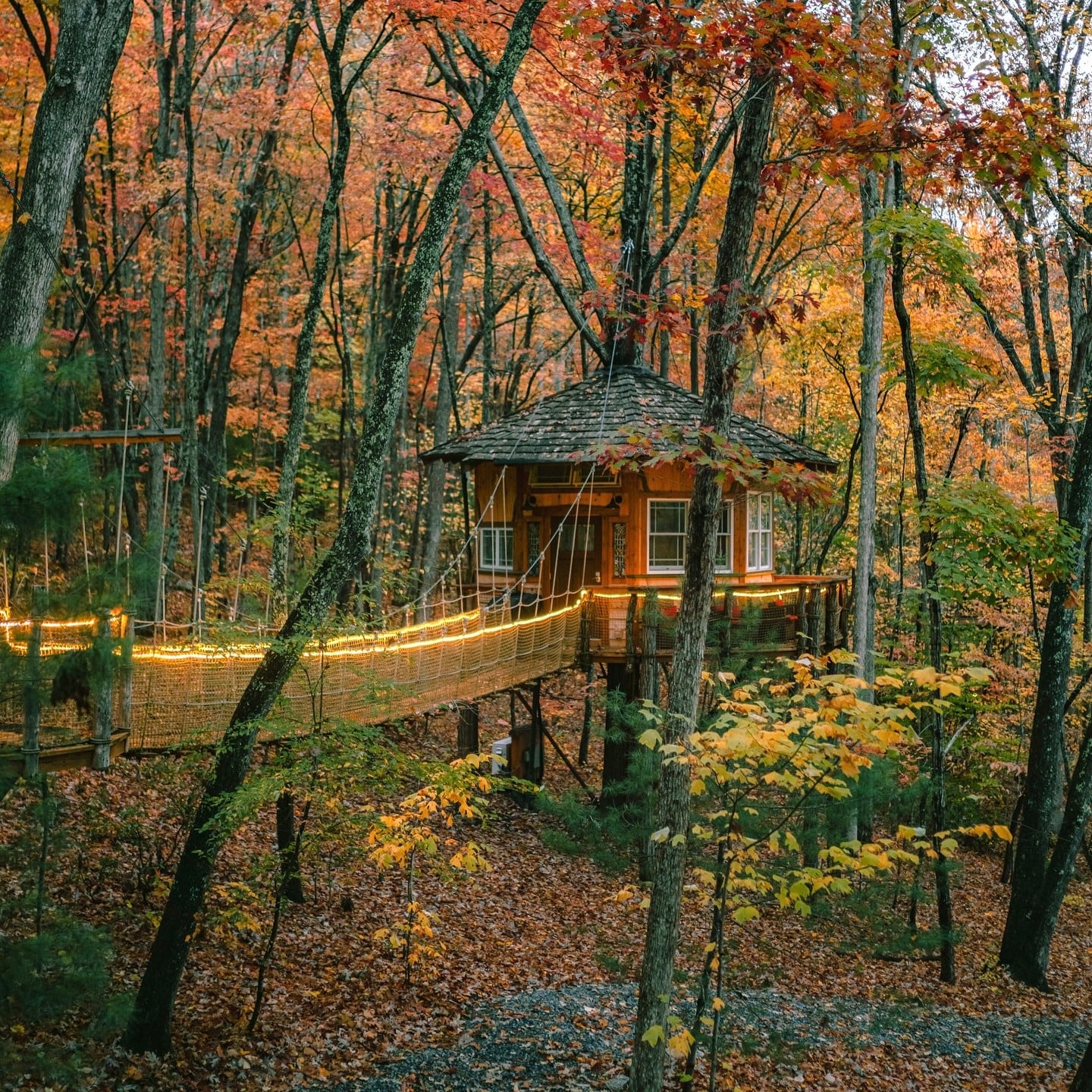 Rock City Gardens transforms into an autumn wonderland where carefully maintained trails wind past natural rock formations framed by fall foliage. The famous “See Seven States” viewpoint becomes even more impressive during autumn, as the rolling hills stretch toward the horizon in waves of red, orange, and gold.